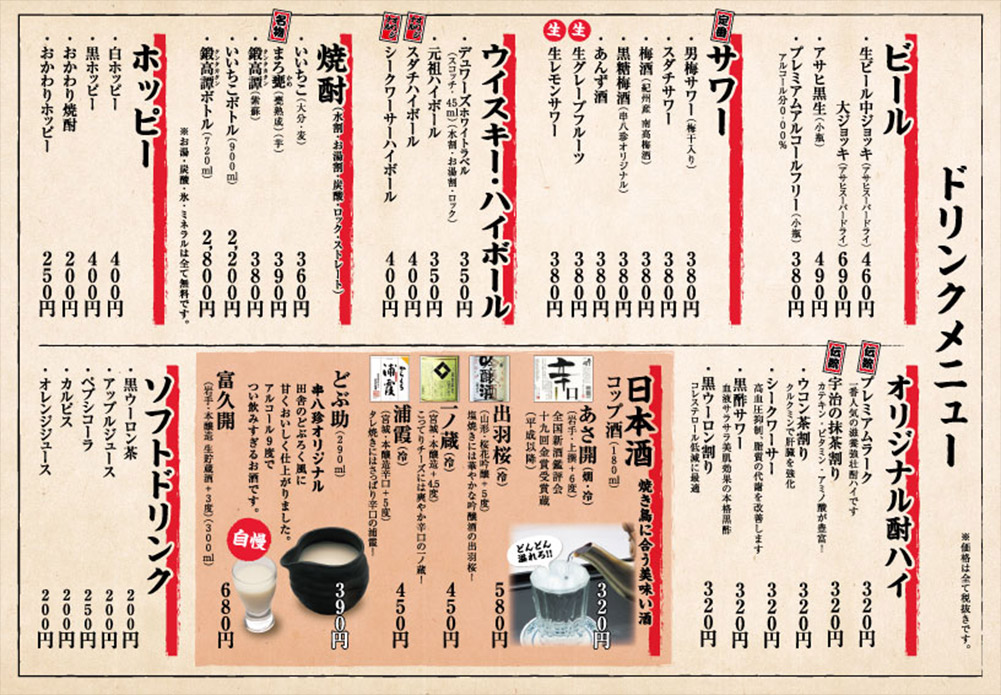中心に、鶏料理や、お酒に合う居酒屋メニューをお楽しみいただけます。