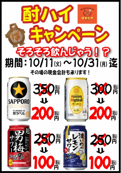 がっつり!スパゲッティぱすたや 10月11日(火)~31日(月)まで酎ハイキャンペーン開催します! 2022-10-07 16:50:18 がっつり!スパゲッティぱすたや 10月11日(火)~31日(月)まで酎ハイキャンペーン開催します!