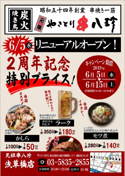 2019年6月5日(水)「元祖串八珍浅草橋店」リニューアルオープン!