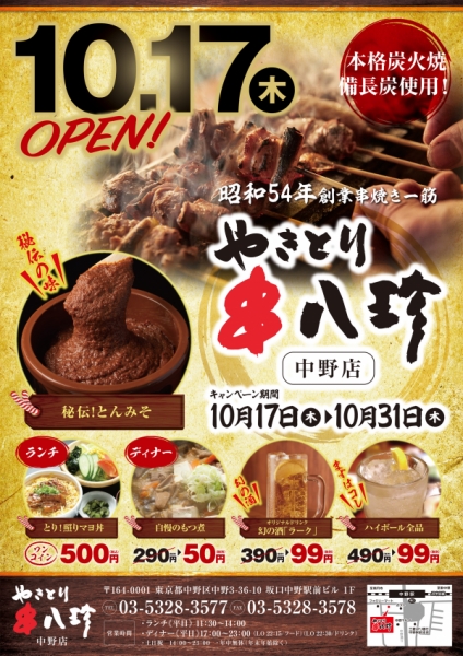 10月17日(木) 串八珍中野店OPEN! 10月31日(木)までお得です。ランチ「ワンコイン」で!