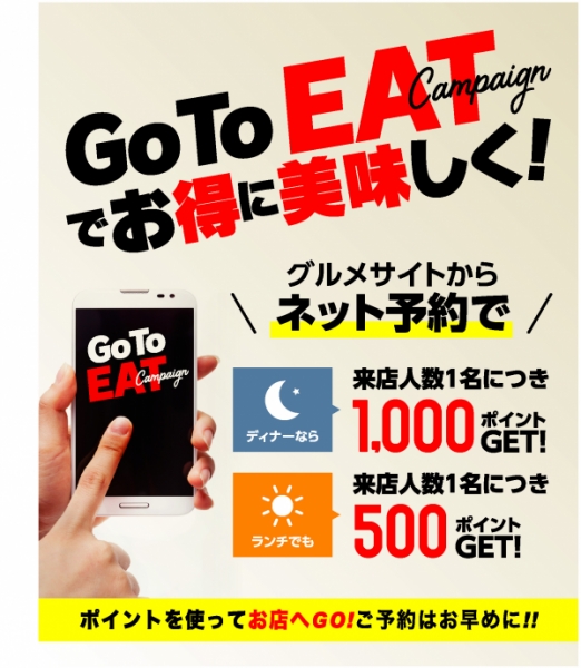 Go To Eatでお得に! 2020-10-26 10:34:17 Go To Eatでお得に!Go To Eatでお店を予約!ポイントでお得に Eat!ご予約お待ちしております!各店頭にQRコードをご用意しております。