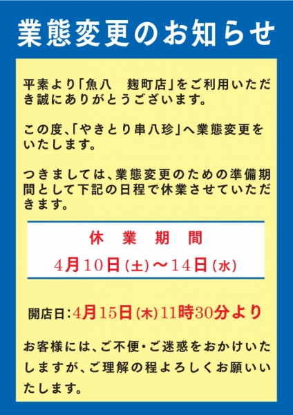 豊創フーズ 株式会社 魚八麹町店業態変更のお知らせ