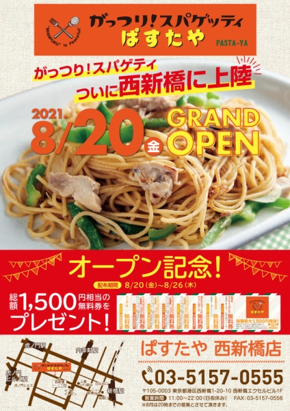 がっつり!スパゲッティ ぱすたや西新橋店 8月20日(金)GRAND OPEN !! 2021-08-04 18:14:23 がっつり!スパゲッティ ぱすたや西新橋店8月20日(金)GRAND OPEN !!