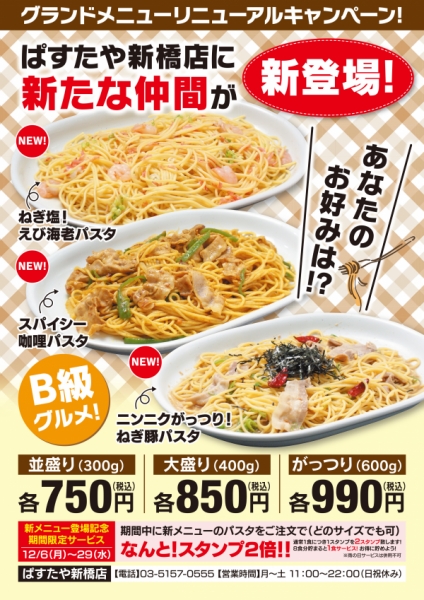 グランドメニューリニューアルキャンペーン! 2021-12-02 12:34:38 グランドメニューリニューアルキャンペーン!がっつり!スパゲッテイぱすたや西新橋店12月6日(月)より29日(水)まで、スタンプ2倍!