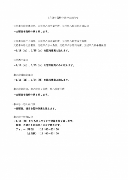 1月度の臨時休業のお知らせ
